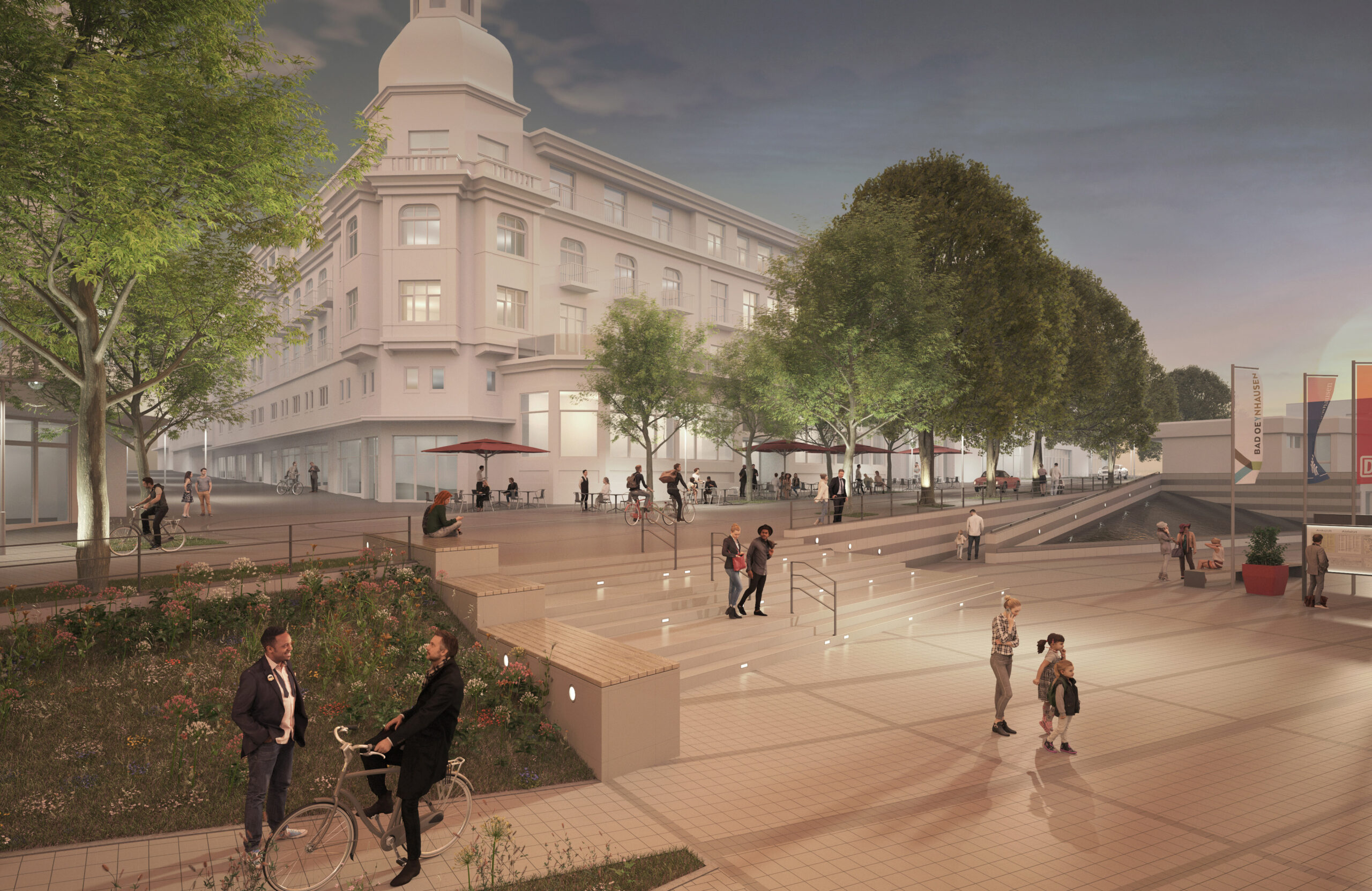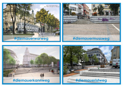 Der Bahnhofsvorplatz liegt topografisch ungefähr 1,30m unter Niveau des Zugangs zur Fußgängerzone, das zu einer räumlichen Zäsur führt. Dieser Effekt wurde vor Jahren durch die Herstellung einer 1,00m hohen Brüstungsmauer, mit einem Treppendurchbruch von nur 4,00m Breite, noch verstärkt.