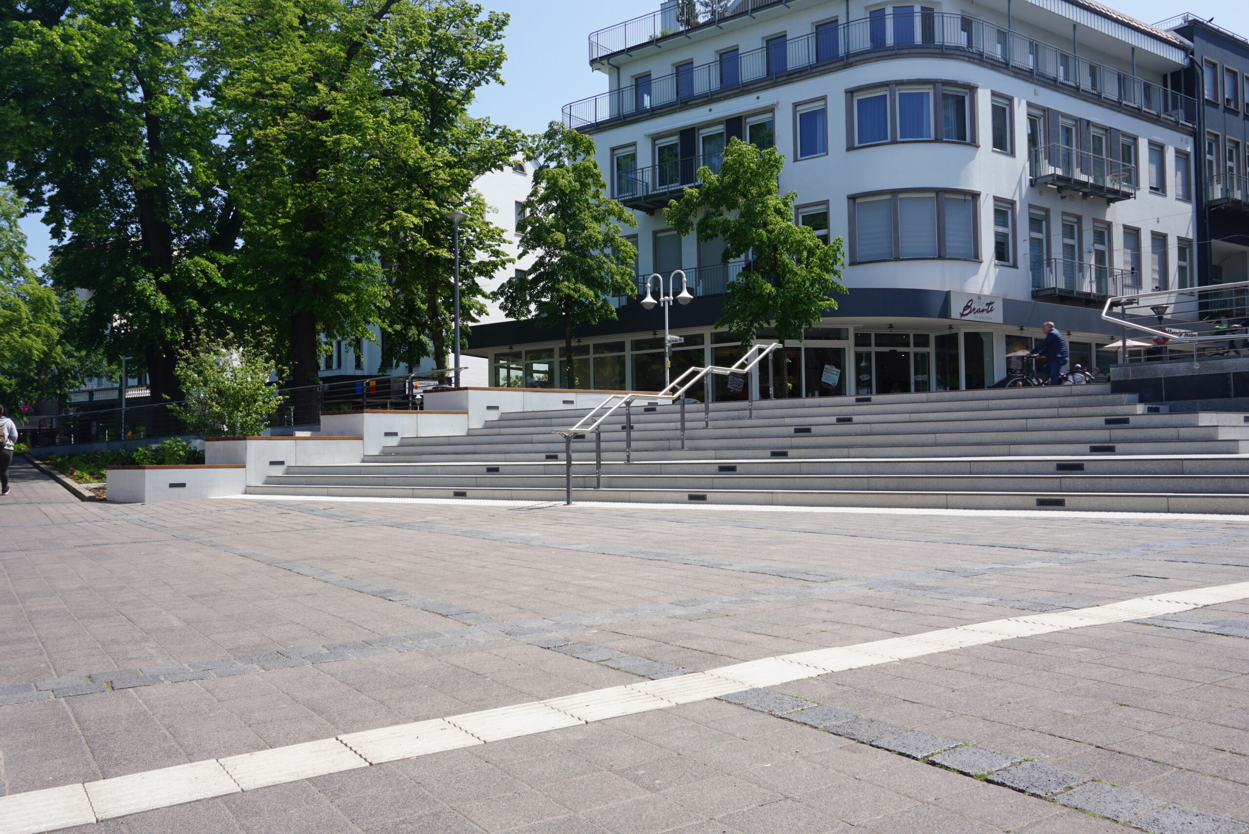 Den Belangen der Barrierefreiheit wurde ebenso Rechnung getragen, so sind die Treppen mit Kontraststreifen versehen. Die taktilen Leitsysteme der Fußgängerzone und des Bahnhofs werden über die Treppe weitergeführt.
